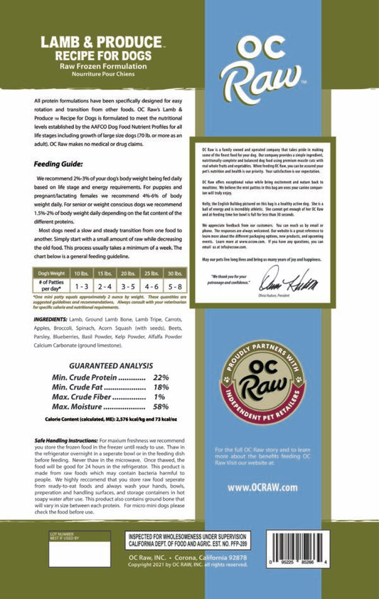 OC Raw Frozen Raw Dog Food Lamb & Produce Patties 6lb