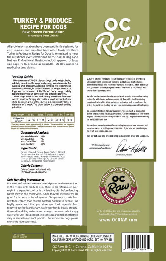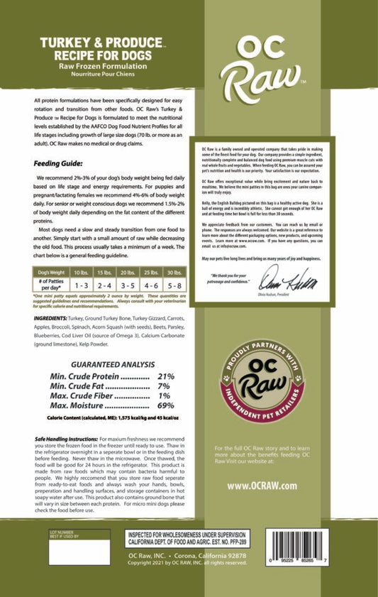 OC Raw Frozen Raw Dog Food Turkey & Produce Patties 6lb