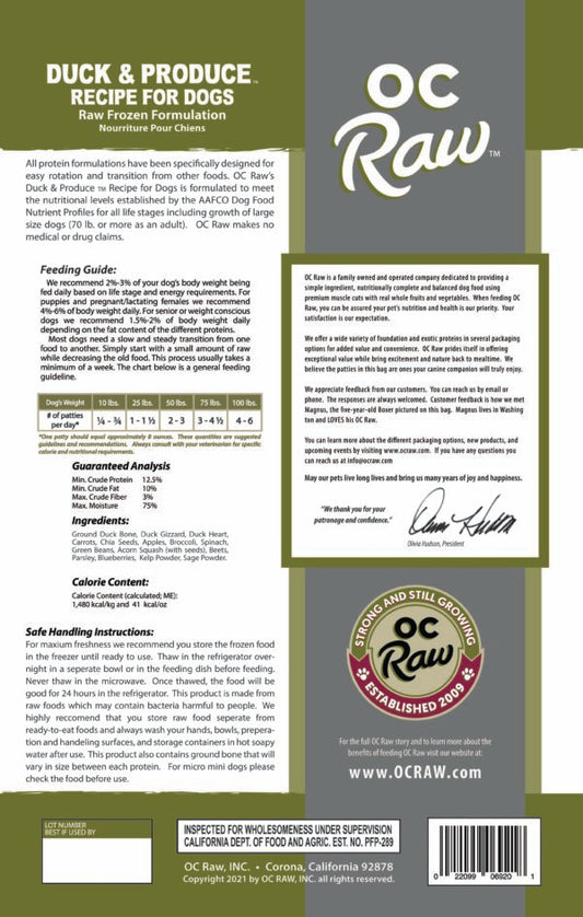 OC Raw Frozen Raw Dog Food Duck & Produce 6lb