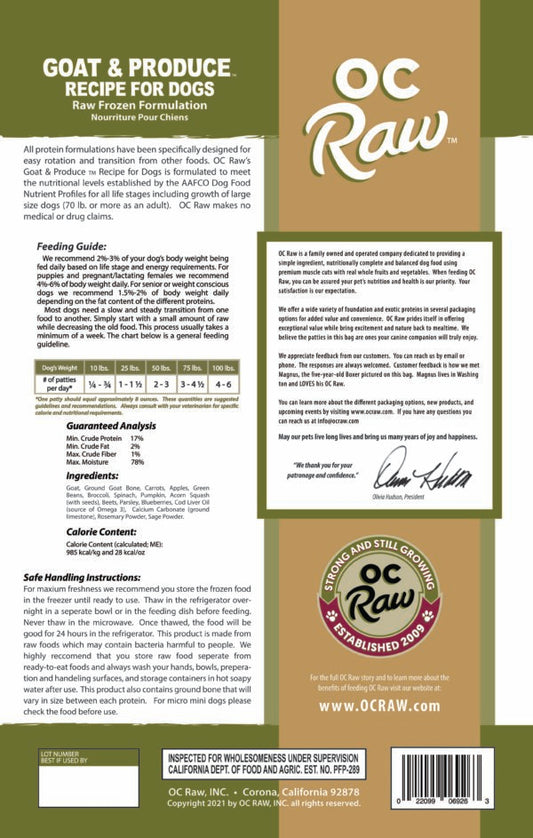 OC Raw Frozen Raw Dog Food Goat & Produce Patties 6lb