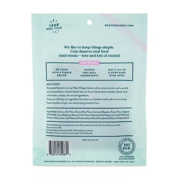 Here kitty kitty, it’s treat time! Yep, that’s right - Bocce's is now baking for cats. We made a soft, chewy treat (in a cute heart shape!) with all-natural, limited ingredients– perfect for everyday treating. Baked with tasty USA chicken (our #1 ingredient) and delicious catnip, these bite-sized treats will have your furry friend purring for more. At just 1 calorie per bite, you can feel good treating your cat to a yummy recipe with healthy, simple ingredients (it’s a win-win!)