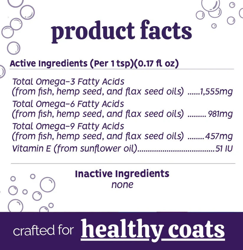 Active Ingredients: Wild caught fish oil (from mackerel, sardine, and anchovy), Hempseed Oil, Flaxseed Oil, and Vitamin E (from sunflower)