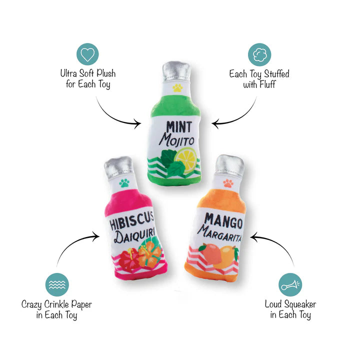 Tropic like it's hot! Our “From the Cooler” 3 piece mini plush toy set is perfect for the pup that likes to play all day. Made with a loud squeaker and crazy crinkle paper in each toy, this trio will give playtime a fun twist.