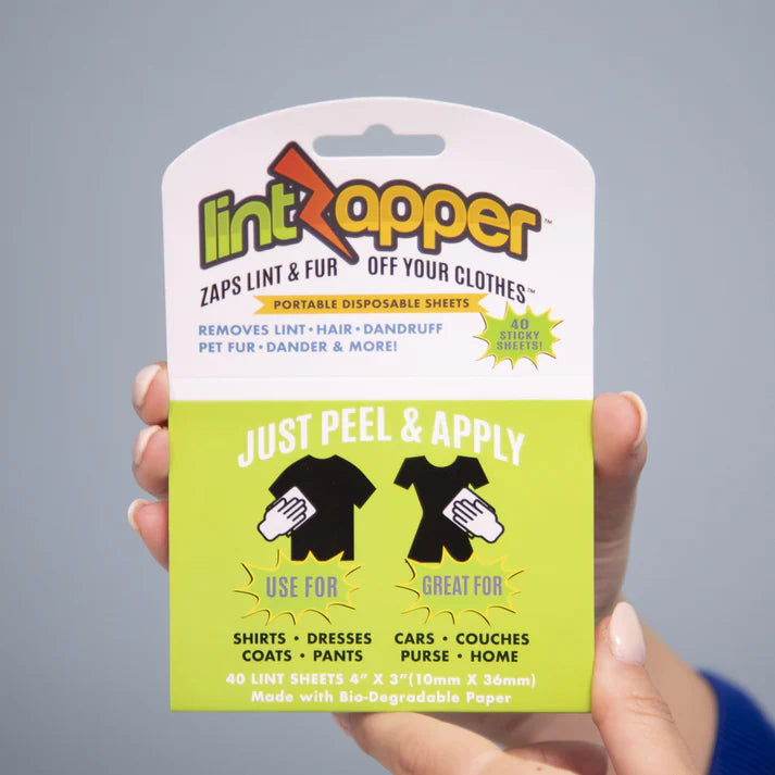Simply open the small pack, peel off a sheet, and apply to your clothing, then toss the sheet out when you’re done. Lint Zappers were designed to take with you anywhere. Use at home before heading out for the day, and toss it in your pocket or bag for quick touch-ups on the go. Lint Zappers are versatile and can even be used to get hard to reach lint, hair and crumbs out of bags, luggage, inside cup holders in the car, etc. LintZapper is made of recyclable cardboard and biodegradable sheets so it’s safe for the environment.