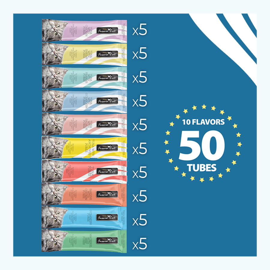 Your cat's favorite easy squeezy treats are preselected in this 50 count variety pack making treat time easy, convenient, and fun! The Fussie Cat variety container comes with 5 each of 10 purrfect flavors--a rich assortment of creamy, irresistible purees guaranteed to excite and delight!