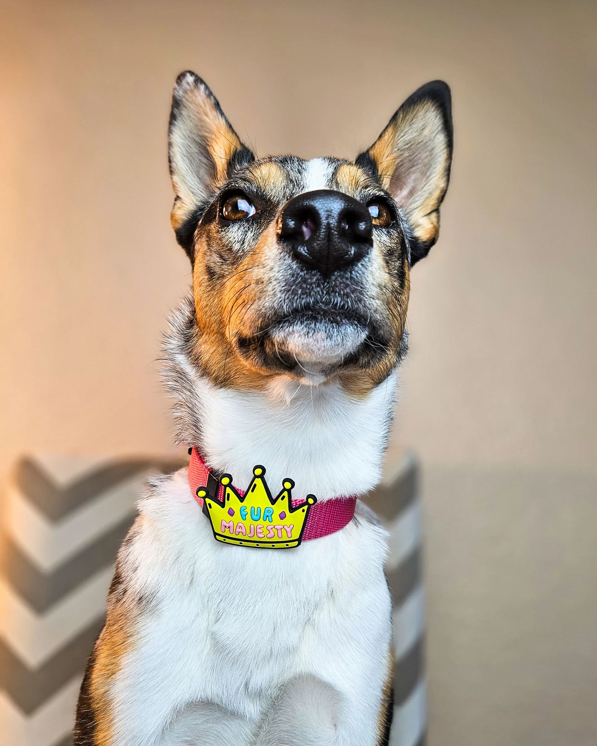 Hear ye, hear ye! This noble crown was forged for the one true ruler of your realm - your dog. Adorn their collar, harness, and leash with this Jiby, for they reign over the bed, couch, kitchen, yard, hallway, bathroom, dining table… and your basically everything else in your home.
