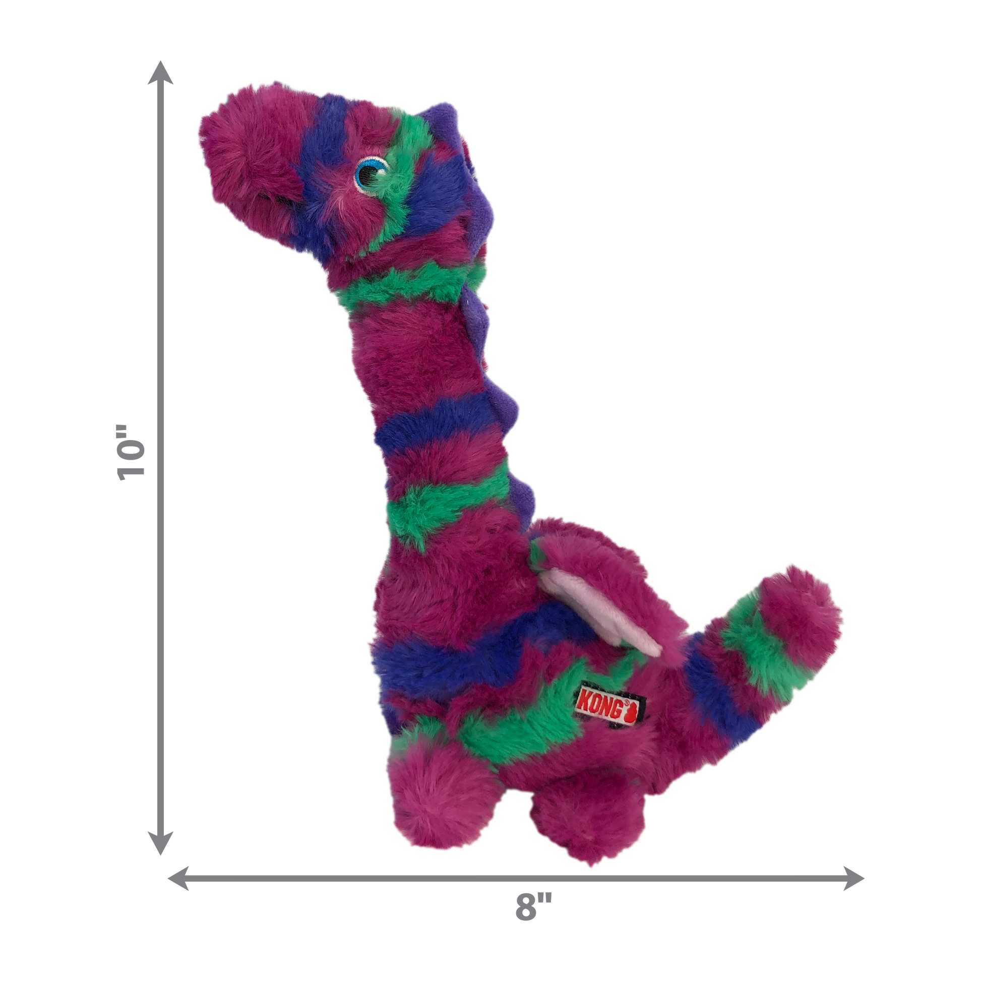 KONG Shakers Honkers Dragon’s magic lies in his internal neck tube that delights dogs’ natural instincts with an irresistible crunch that kicks up the fetching fun. His long, floppy body fuels shaking action and is great for tugging while the low tone squawk sparks interest and keeps dogs playing longer with a plush-covered pal great for cuddling in the liar after the action.