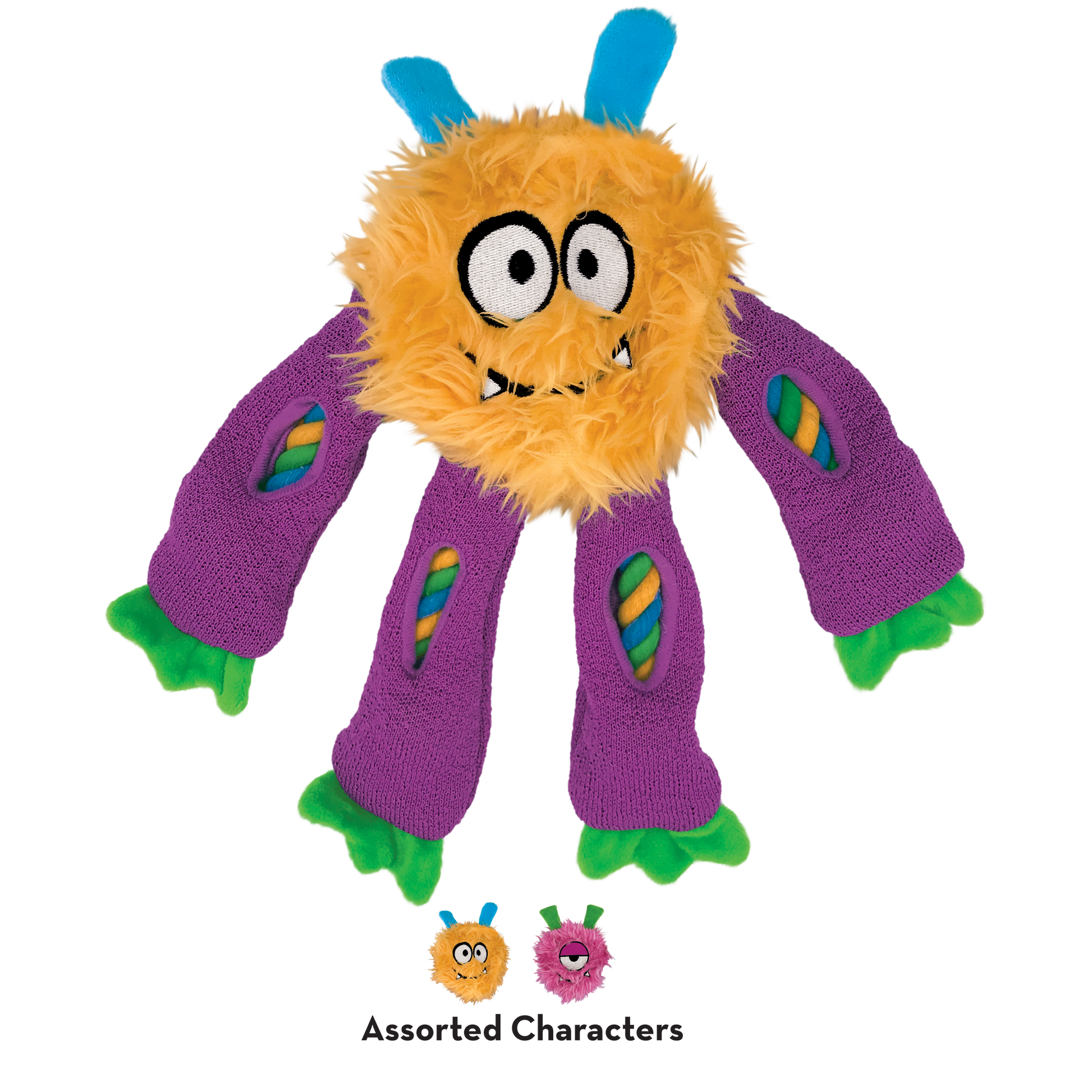 Sneakerz Knots’ sturdy internal rope features a rope knot in the head that extends through the legs providing an outlet for appropriate chewing behavior. Unique, peek-a-boo windows pique curiosity and extend the engagement with foraging fun. Long, dangly legs are great for shaking play and a grippy tennis shoe material legs squeak for interactive tugging playtime galore with these grinning pals.