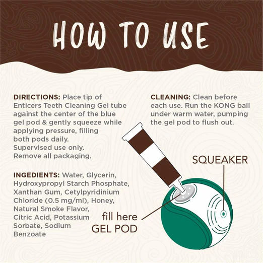 TropiClean Enticers Dental Ball Kit makes play time - teeth cleaning time! Includes a 1oz tube of Enticers Smoked Beef Brisket Flavored Gel for a delicious treat that cleans their teeth while they chew. The durable KONG ball is specially textured to help scrub away plaque while gel works to remove bad breath-causing bacteria in the mouth. Vivacious squeaker keeps dogs engaged and coming back for more every time!