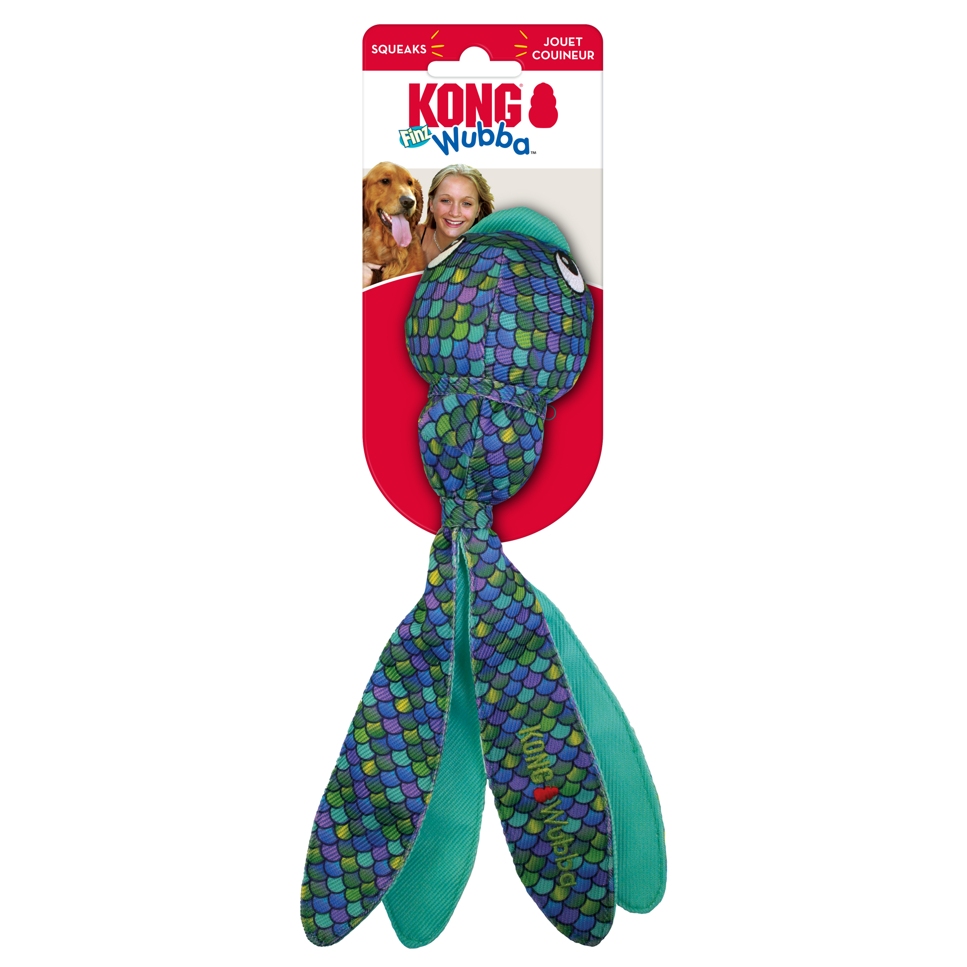 The new KONG Wubba Finz has long floppy tails that make it easy for tugging and super fun for your dog to shake, satisfying natural thrashing instincts. Two balls inside help KONG Wubba Finz bounce and squeak, extending games of catch and release for tons of healthy, active play. This flying fish is made to soar through the air and launch your dog into a fetching frenzy!