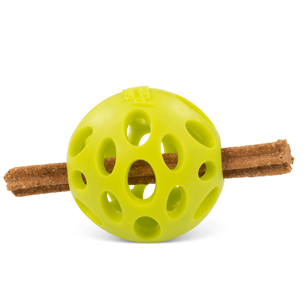 - This 3.1" ball can be stuffed with treats to help engage your mutt a little longer.